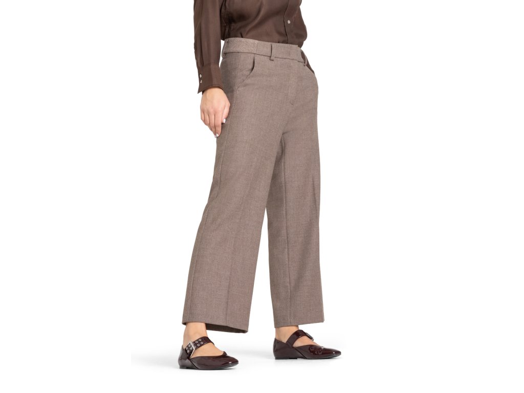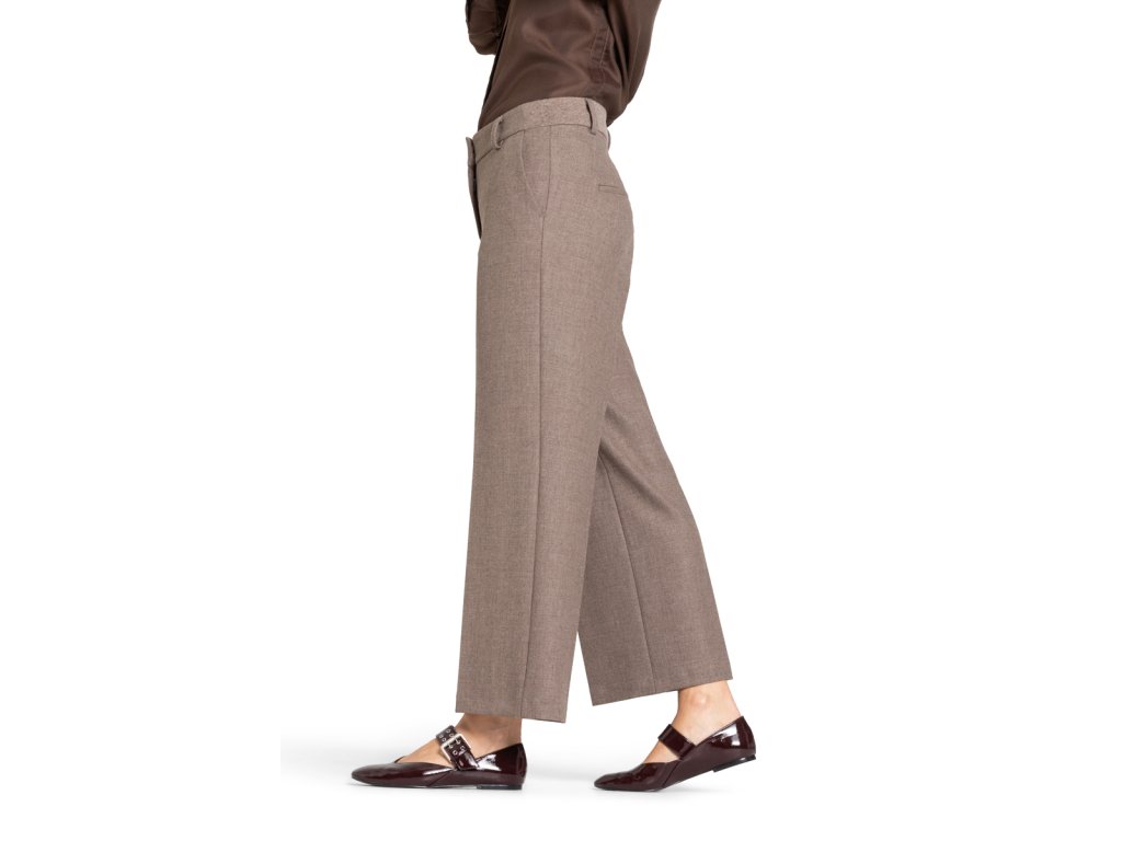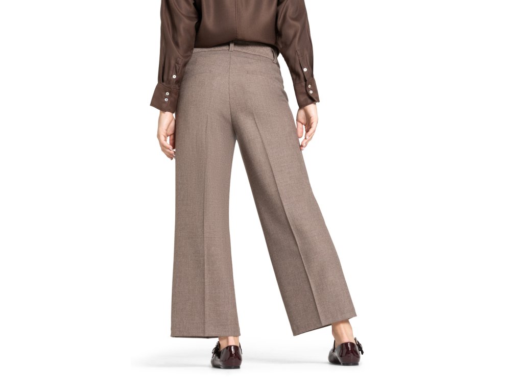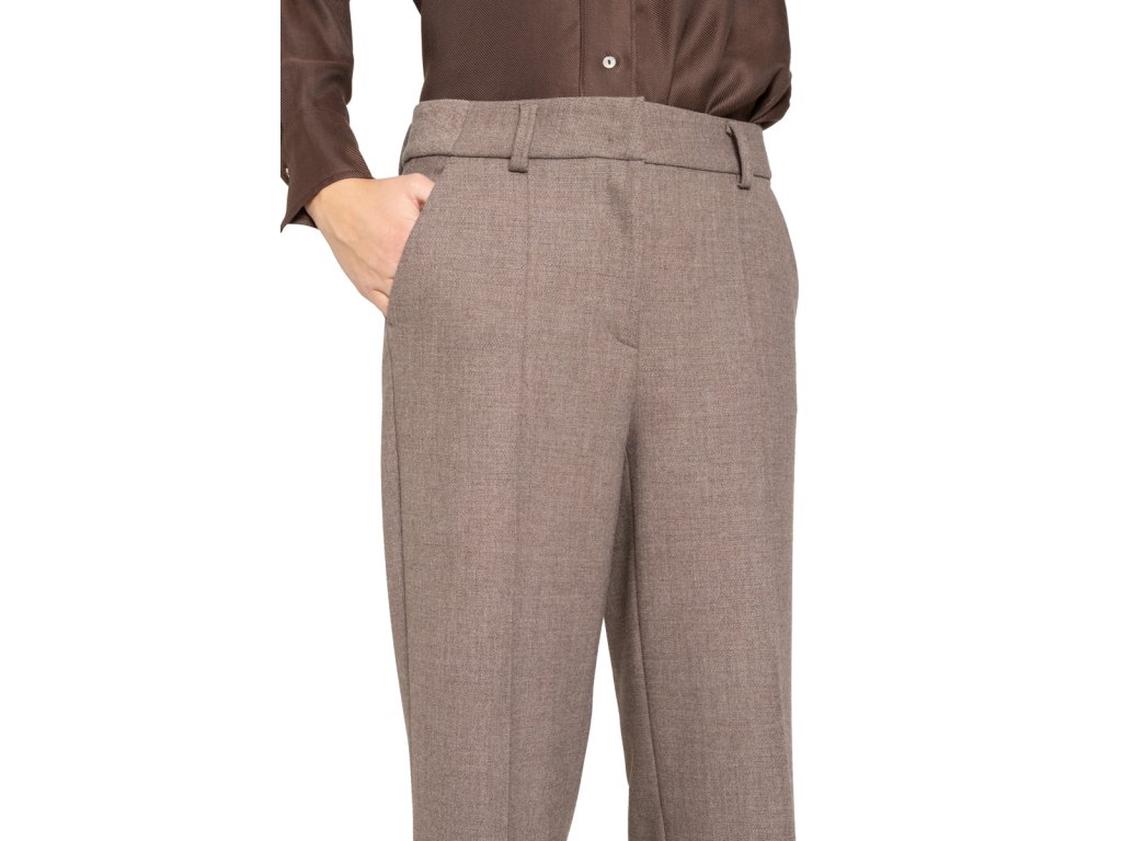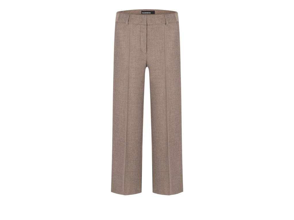 Kalhoty Cambio California v odstínu ash hnědobéžová mají rovný širší a kratší střih s puky, který lichotí postavě a působí elegantně. Materiál s podílem vlny jim dodává jemnou strukturu a příjemný komfort. Zapínání na zip a čisté zpracování dotváří jejich nadčasový výraz.
