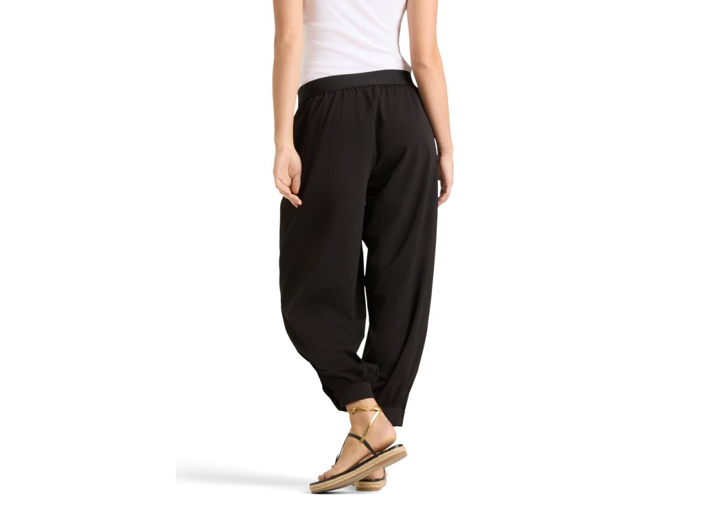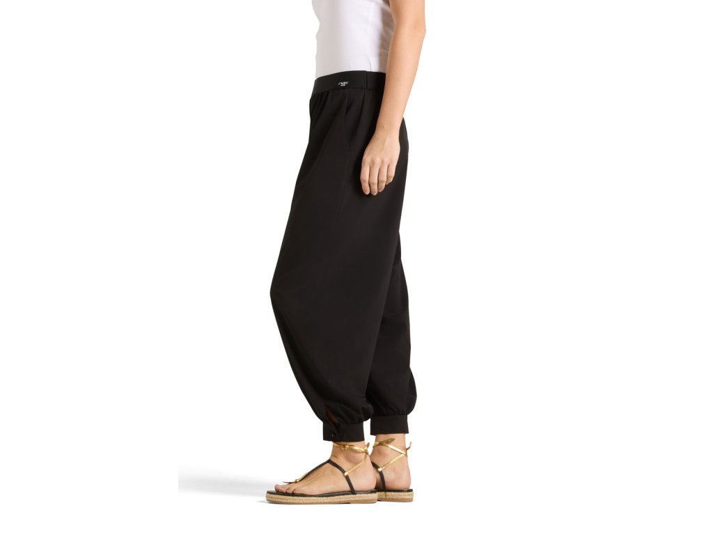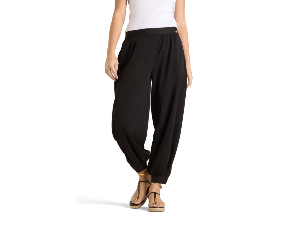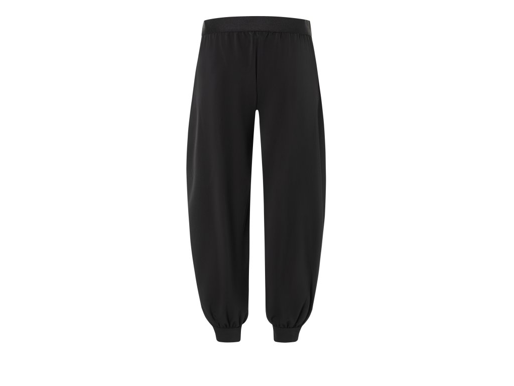 Zkrácenou délku nohavic zakončuje manžeta, která v kombinaci s gumou v pase dodává kalhotám uvolněný, lehce sportovní nádech. Nabízejí přesně ten prostor a komfort, který potřebujete, a přitom si díky preciznímu zpracování zachovávají svou eleganci. Je to ideální volba pro dny, kdy chcete spojit uvolněný styl s moderním střihem, který působí velmi žensky.