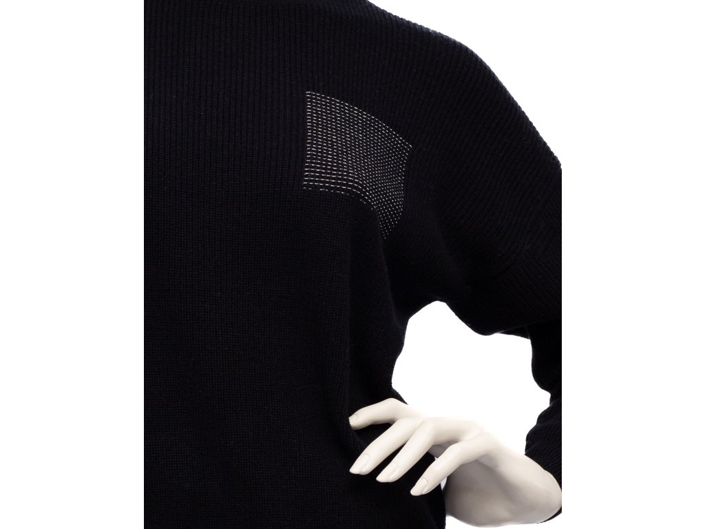 Představujeme vám nádherný černý svetr od značky Peserico. Tento svetr s jednoduchým rolákem a dlouhým rukávem bude skvělým doplňkem vašeho outfitu. Jeho výjimečnost podtrhuje ozdobná kapsička z jemných kamínků, která je charakteristická pro tuto značku. Svetr je vyroben vlny, kašmíru a hedvábí, což zaručuje nejen příjemný pocit na těle, ale i vysokou kvalitu materiálu. Složení svetru je 70% vlna, 10% kašmír a 20% hedvábí. Doporučujeme prát tento svetr ručně, aby se udržoval v co nejlepším stavu.