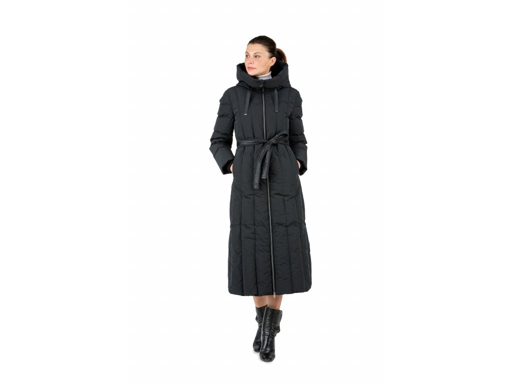 Polyesterový kabát je proštepovaný novým , módním způsobem prošití. Ačkoliv součástí kabátu je textilní pásek, kabát má mírně projmutý střih, takže ho lze nosit i bez pásku. V dolní části postranních švů jsou umístěny kryté zipy, které při rozepnutí vytvoří a tvar dolní části kabátu. Součástí kabátu je plnohodnotná kapuce. Kabát využívá střídání matných a lesklých ploch, což je zřejmé především na zadní části kabátu. Zapínání je řešeni oboustranným zipem. Na předním díle jsou umístěny 2 svislé kapsy Rukávy jsou uvnitř zakončeny elastickým nápletem, který zamezuje vniknutí studeného vzduchu. Materiál: 100% polyester. Kabátová výplň: peří. Kabát je možno prát. Číslování velikostí je italské.