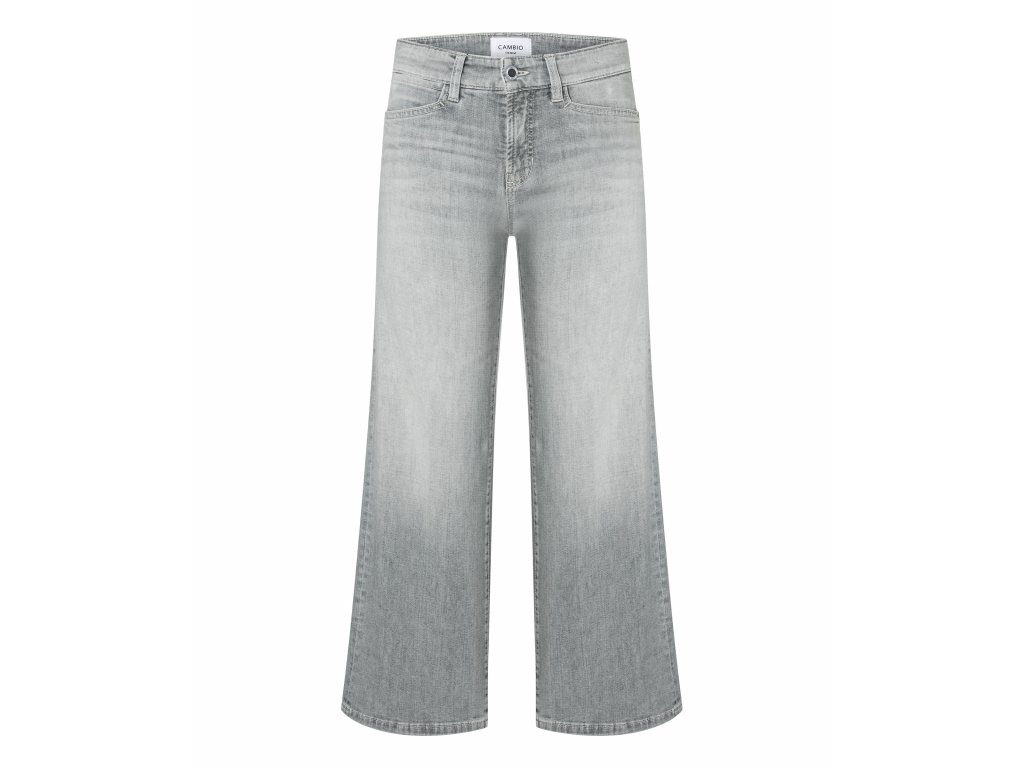 Krásné měkoučké široké džínové kalhoty Cambio mají velmi atraktivní, světle šedou barvu. Kalhoty mají vyšší sed. Na předním díle jsou nohavice v oblasti stehen vyšisované. Toto vyšisování se opakuje na zadním díle v oblasti sedu a horní části nohavic. Zadní díl je opatřen 2 našitými kapsami.