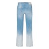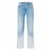 Džínové dámské kalhoty Cambio Francesca jsou extrémně měkké díky vysokému procentu elastického vlákna. Kalhoty mají široké nohavice, zakončené a dolním okraji zdobené jemným třepením. Celé nohavice pak zdobí efekt "degradé", což znamená, že se nohavice směrem k dolnímu okraji zesvětlují. Zadní díl je ozdoben 2 našitými kapsami bez proštepování, kalhoty jsou štepovány v barvě džínoviny.