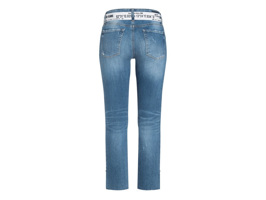 Modré úzké kratké džíny Cambio Tess s rozparkem na konci nohavic a krásným ozdobným páskem s potiskem na bílém podkladu.