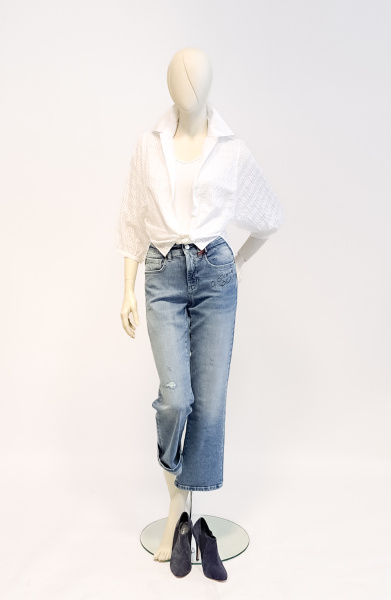 Jako malou ochutnávku jara už nyní připravujeme rovné širší košile, které skvěle fungují navrstvené přes jemný top. Mým favoritem je model od Peserico. Perličky podél límečku nejsou jen krásným detailem, ale mají i svou funkci, límeček díky nim perfektně drží svůj tvar a krásně rámuje obličej. Trendem letošního jara jsou kalhoty Cambio s grafity potiskem.