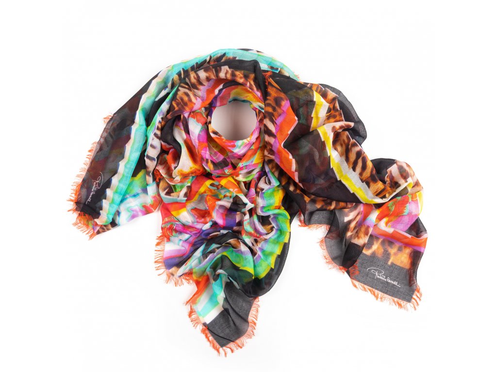 Velká šála italské firmy Roberto Cavalli je svými rozměry opravdu vyjimečná. Je možno ji použít jako šálu, ale především jako šál přes šaty nebo sako. Šála je pestrá a je po celém obvodu zakončena drobným třepením oranžové barvy. Rorměry 140x180 cm. Materiál: 100% modal.