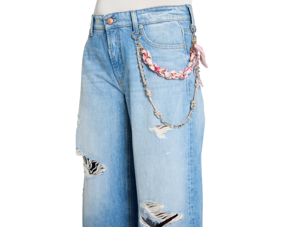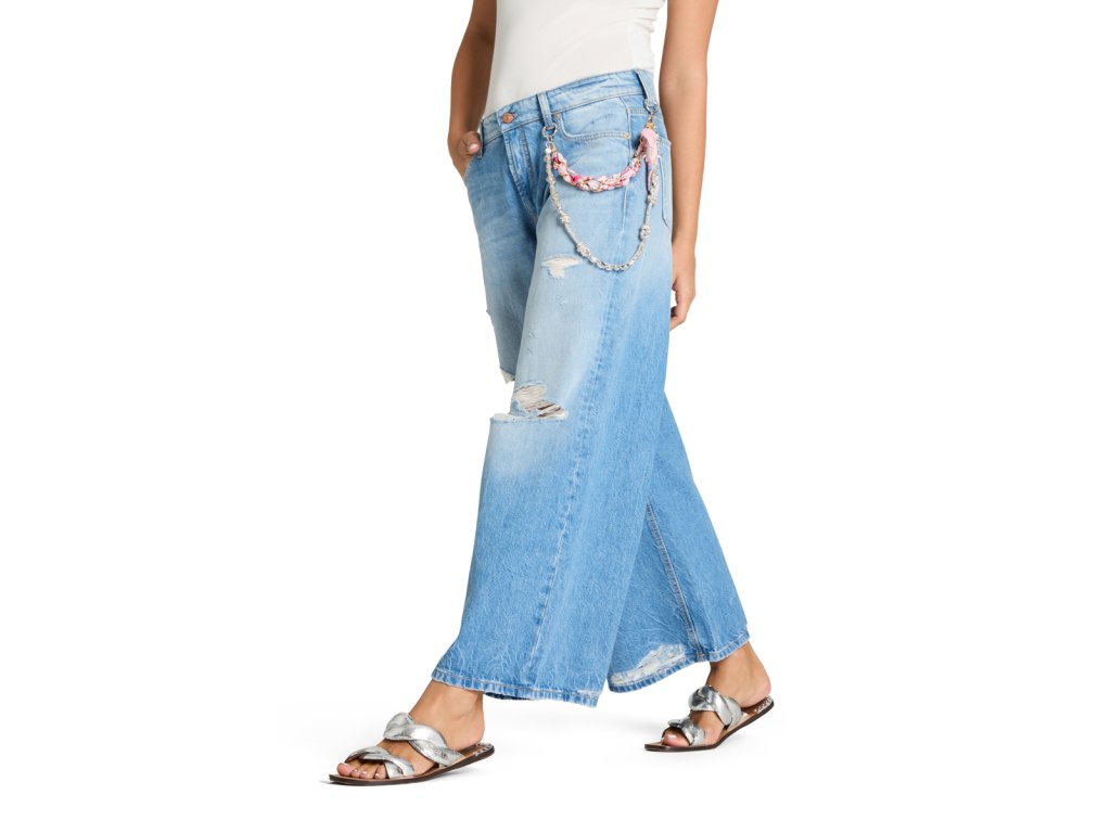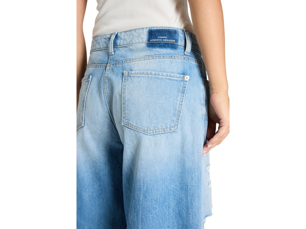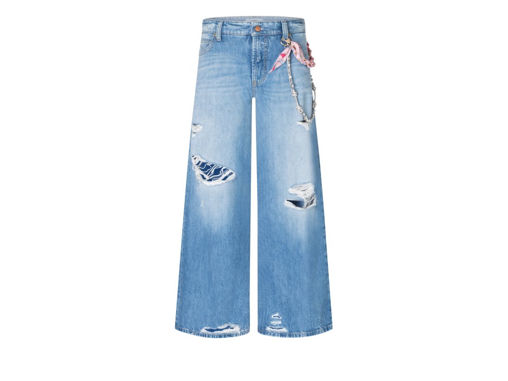 Světle modré džíny Cambio ve střihu Palazzo v sobě spojují uvolněný styl s nepřehlédnutelnými detaily. Široké nohavice v délce 30 palců vytvářejí moderní siluetu, která působí lehce a svěže. Výrazným prvkem tohoto modelu je autentické zdobení v podobě módních průstřihů, které doplňuje stylový řetízek a ozdobný šátek v pase. Jsou to džíny, které vnášejí do šatníku hravost a osobitost, přičemž si díky preciznímu střihu zachovávají svou eleganci. Ideální volba pro jarní nebo letní dny, kdy chcete spojit maximální pohodlí s originálním vzhledem.