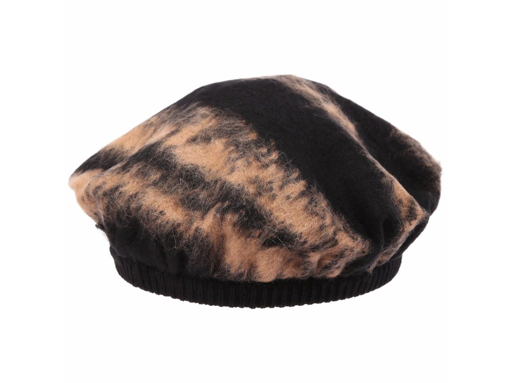 Jemný pletený černo-hnědý baret s příměsí mohéru od značky Moschino. Baret má jemný lem okolo čela. baret má jemný chlup.