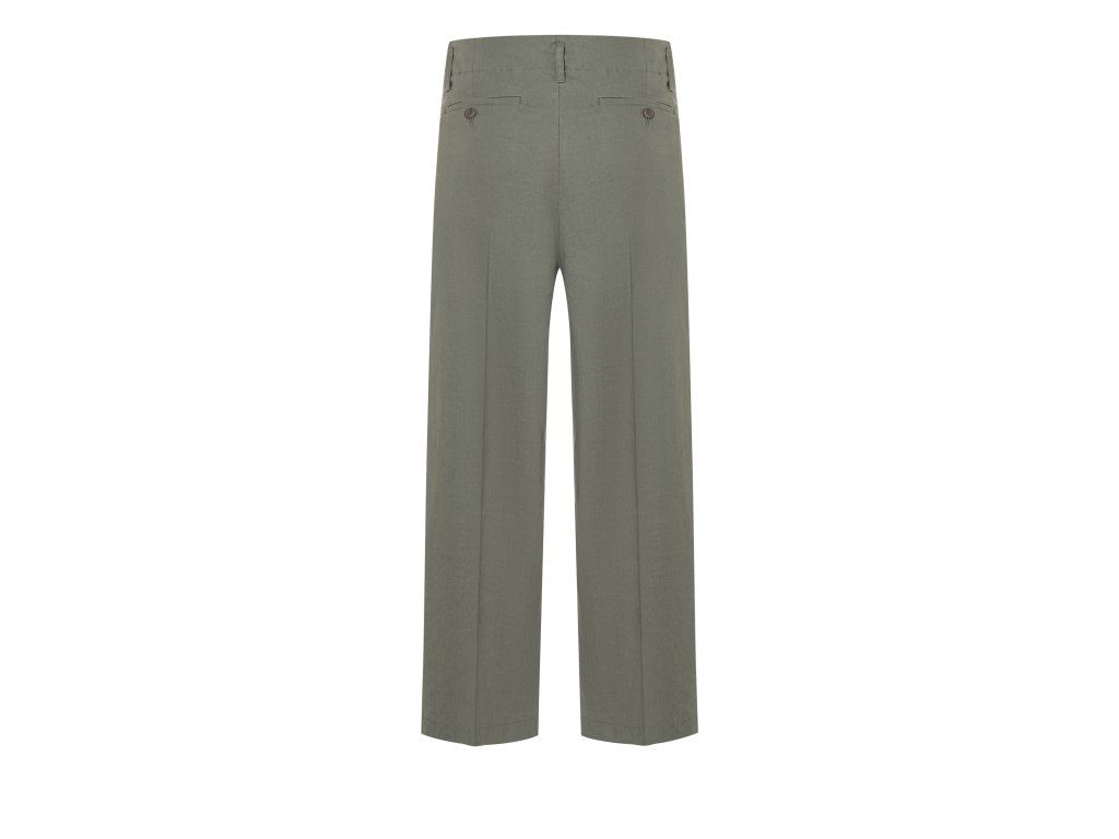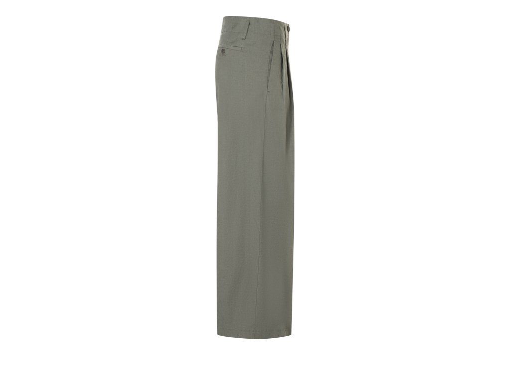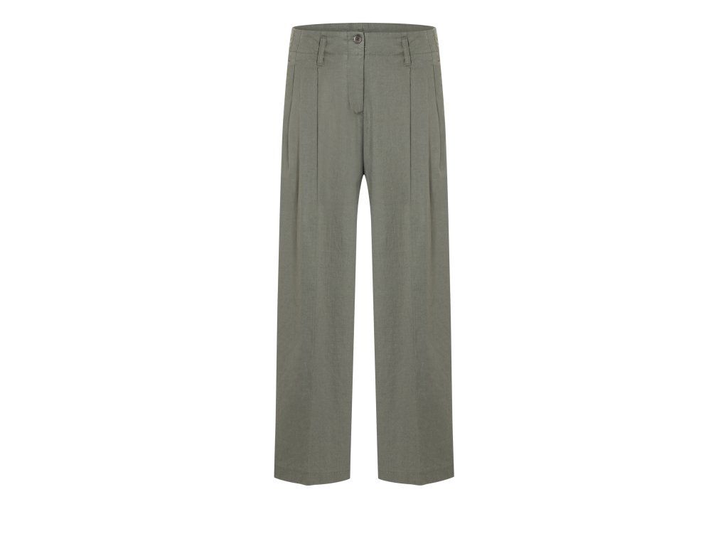Kalhoty Cambio v elegantním zeleném odstínu jsou zosobněním jarní lehkosti a vkusu. Širší střih nohavic v kombinaci s jemným nabíráním vytváří siluetu, která je uvolněná, a přesto velmi kultivovaná. Díky příměsi lnu je materiál ideální pro teplejší dny – je prodyšný, lehký a dodává kalhotám přirozenou strukturu.